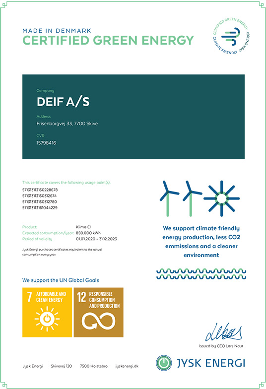 CO2 neutral website: DEIF A/S is part of the CO2 neutral website initiative. The carbon emissions from both the website and the users of the site are offset through the building of new renewable energy sources, various CO2 reducing projects, and through purchasing certified CO2 offsets cleared by relevant government institutions and bodies.